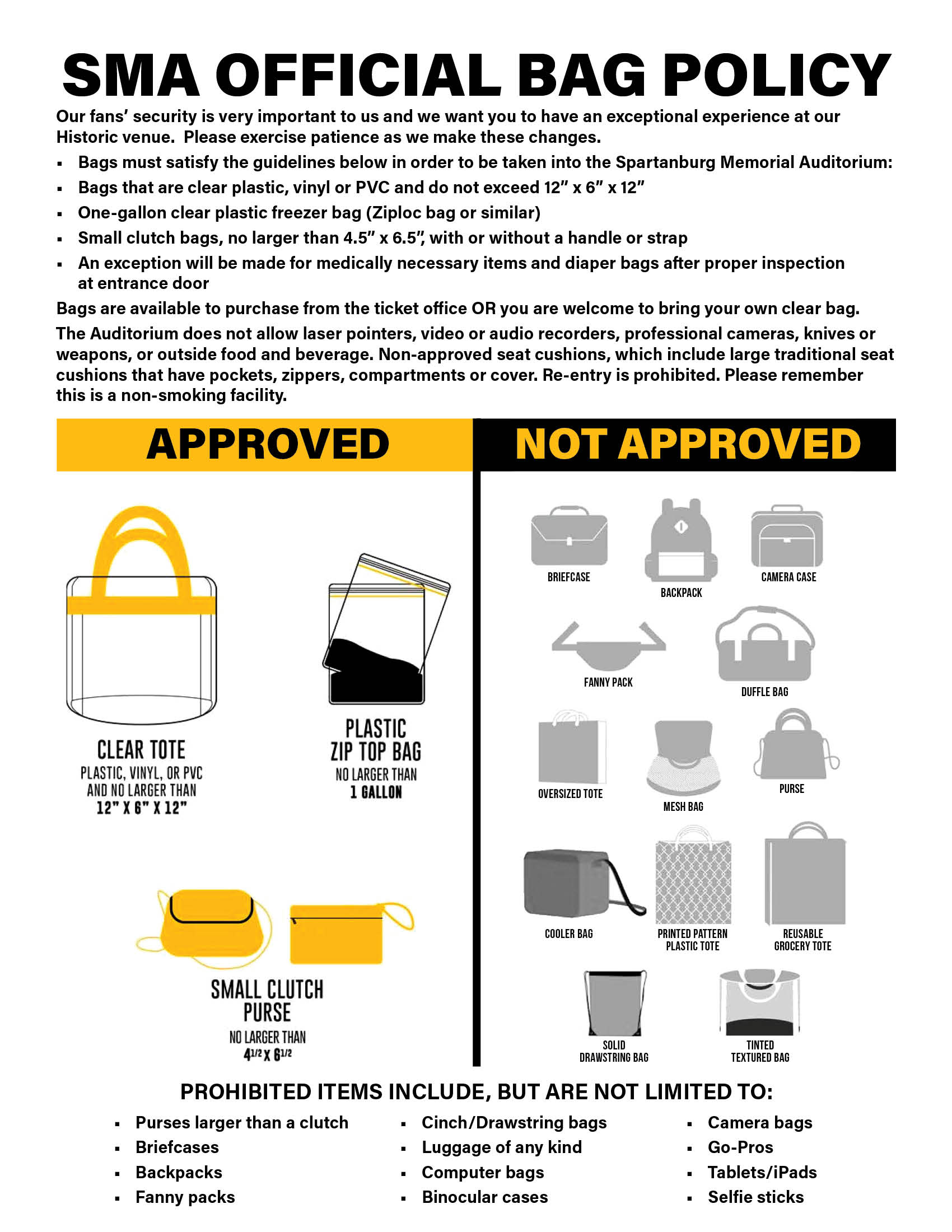 The Spartanburg Memorial Auditorium has a CLEAR BAG POLICY to ensure the safety of all fans. Please click here to see details of prohibited items.